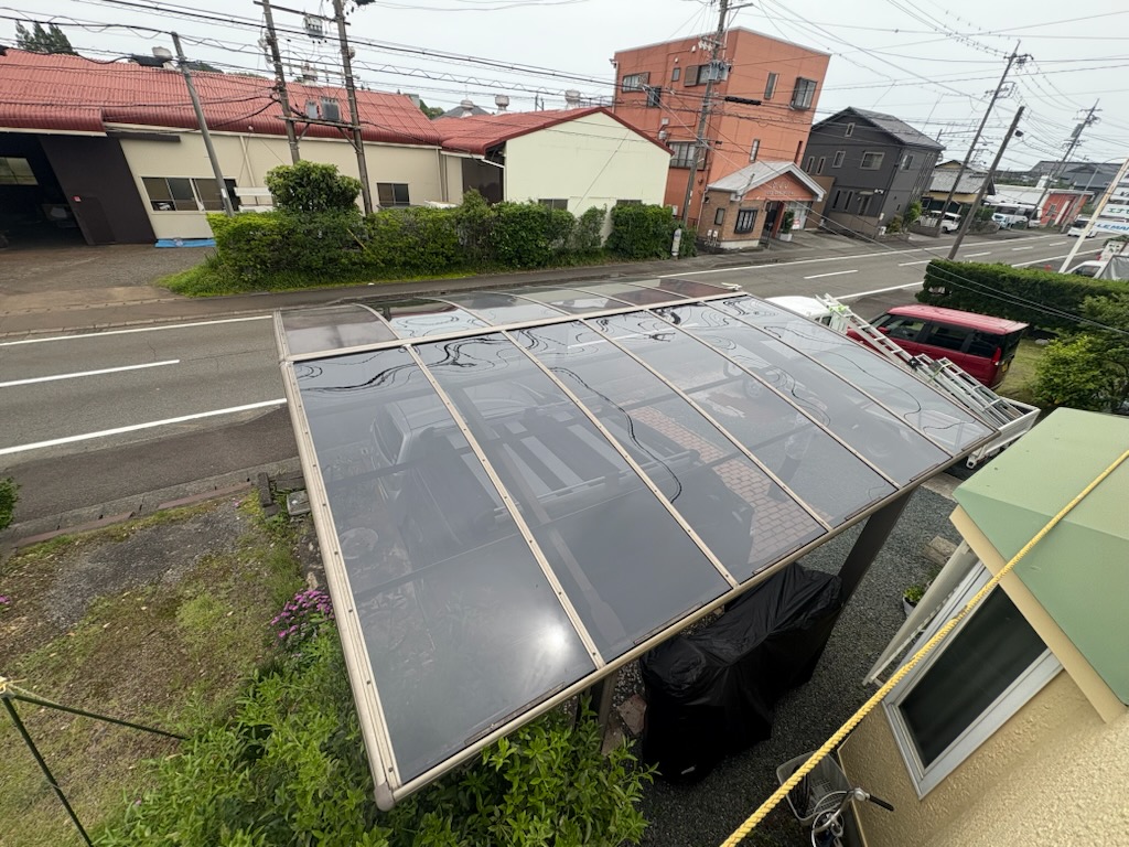 焼津市I様邸にて、雹の衝撃で破損したカーポート屋根のポリカーボネート製平板を新しいものに交換し、機能と美観を回復しました。同時に、被害を受けた雨樋(半丸105)も部分交換・補修し、正常な排水機能を取り戻しました。