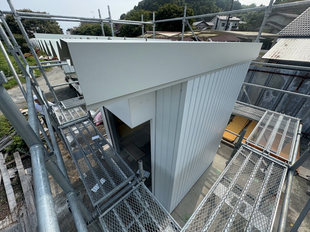 現地では外壁材の加工が難しく、滞在できる日数も限られていたことから、事前に地元の元請様の工場で屋根と外壁を仮組み。各部材の納まりや接合部分の精度を確認し、現場での調整作業を最小限に抑えるよう工夫しました。