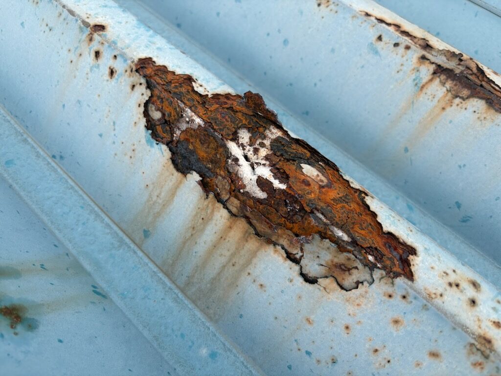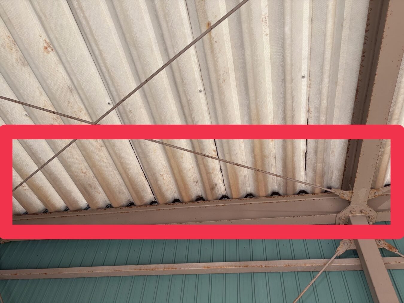 調査した所、原因は既存の折板屋根の裏面に貼られていた結露防止材(ペフ)が軒先で適切に処理されておらず、長年にわたり水分を含み続けてしまったことによる浸食だと考えられます。その影響で屋根材の劣化が進み、雨漏りにつながっていました。(赤枠で囲っているのがペフです)