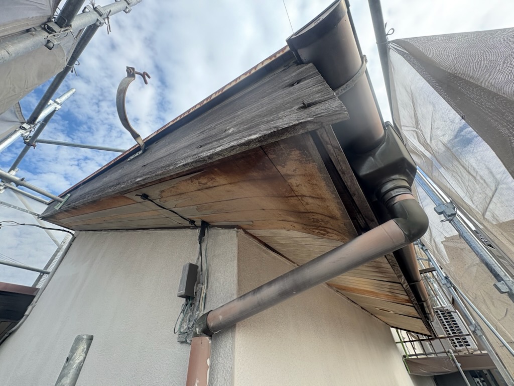 現地確認の結果、雨樋の損傷に加え、屋根まわりや破風板、軒天にも傷みが見受けられました。