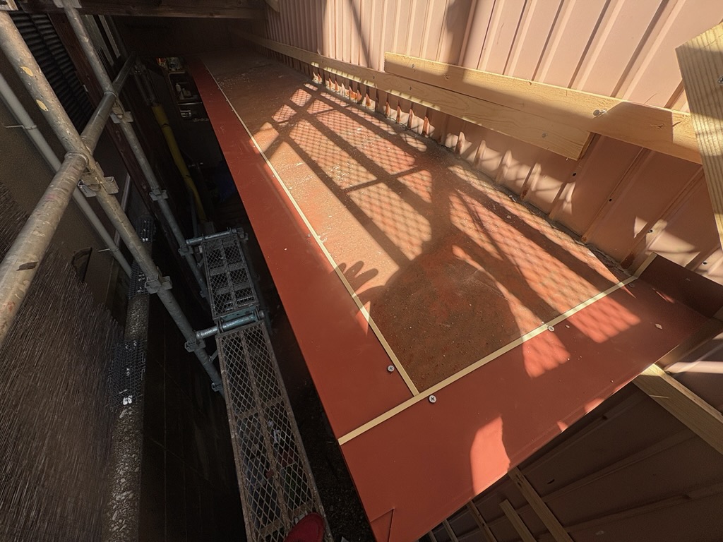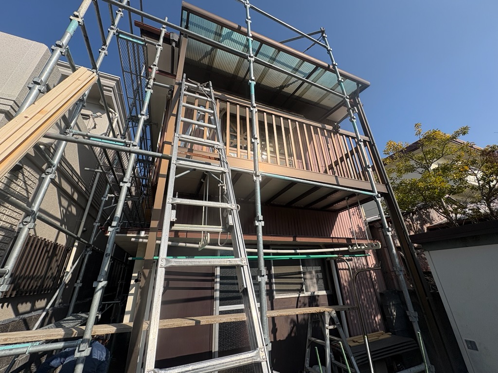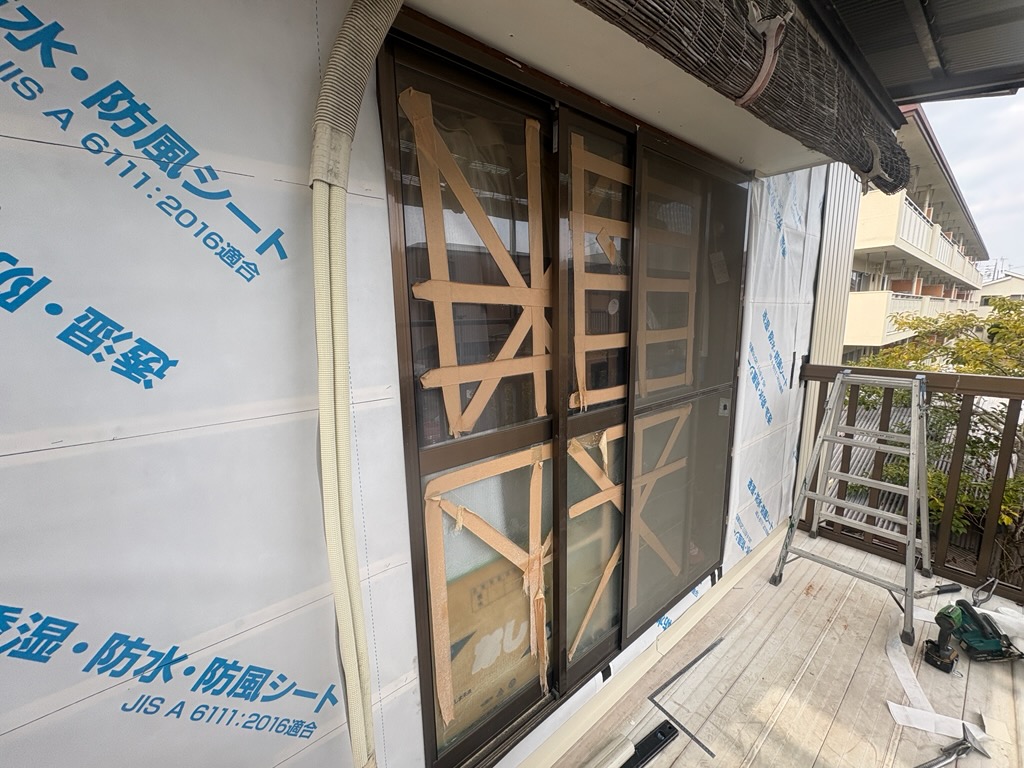 なお本現場は、外壁材の搬入が室内からのみという条件下での施工となりましたが、養生を徹底し、建物へ配慮しながら安全に作業を行っております。