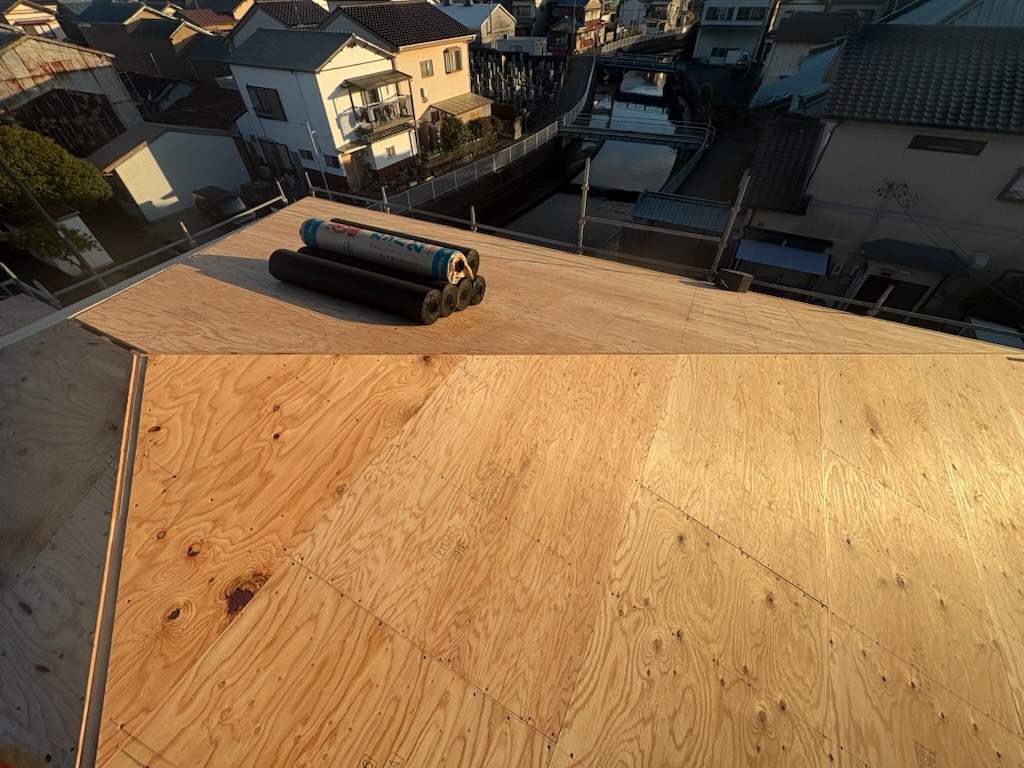 屋根からの排水を確実に処理するため、勾配や納まりを確認しながら丁寧に仕上げています。