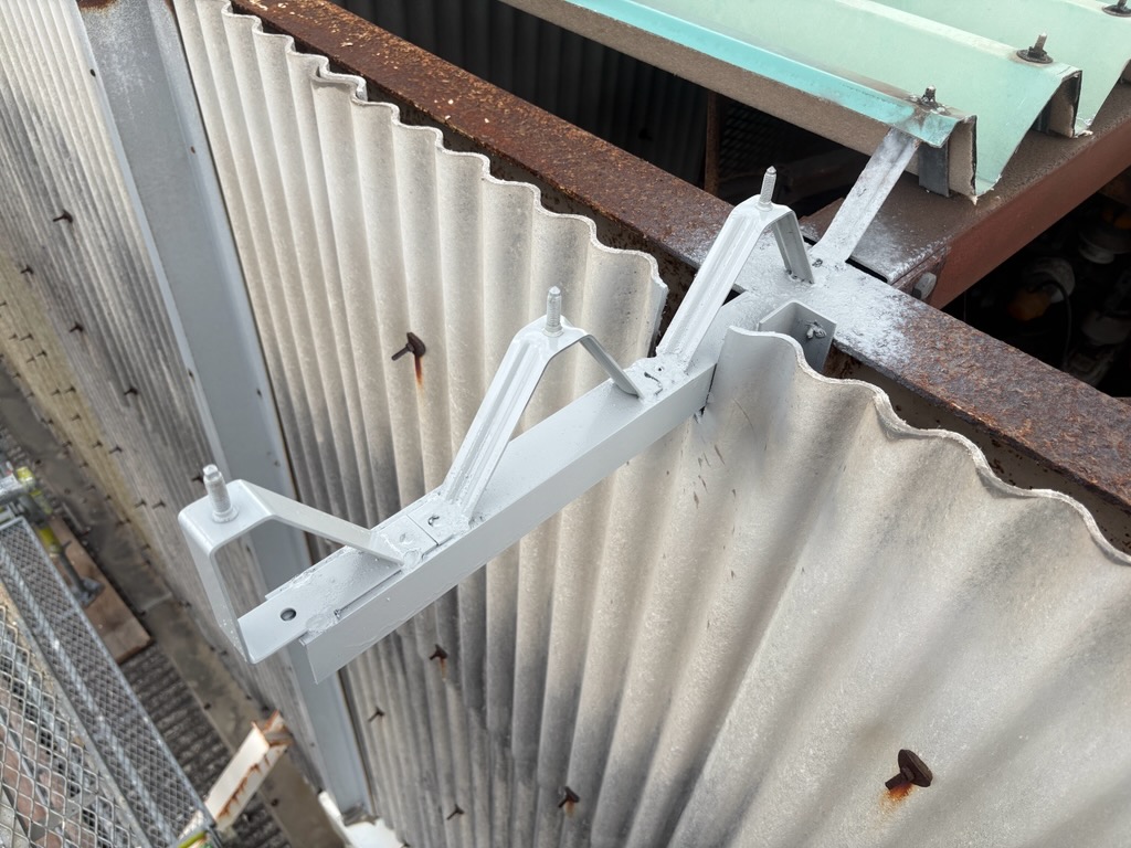 その間、二次被害を防ぐため、めくれた屋根が飛散しないよう介錯ロープを使用し、下方から固定・保持する応急対応を行っております。