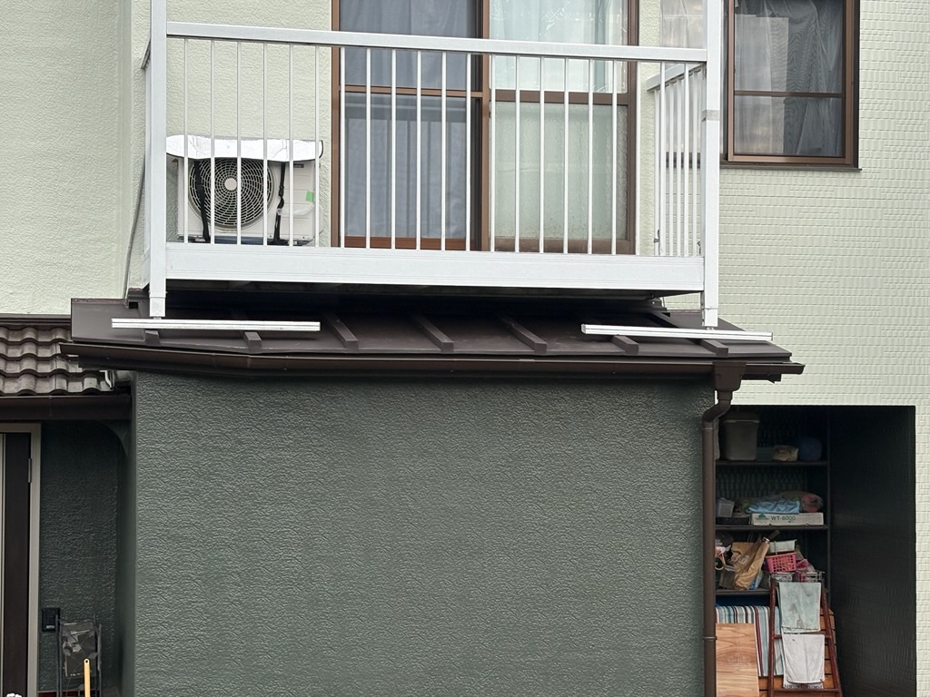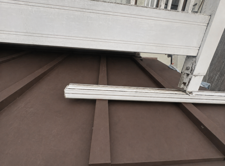 施工は塗装工事完了後、当社にて板金工事を担当。ベランダ全体を解体すると大掛かりになるため、支柱のみを一時的に解体し、屋根(瓦棒屋根)の貼り替えおよび各所の補修を行いました。