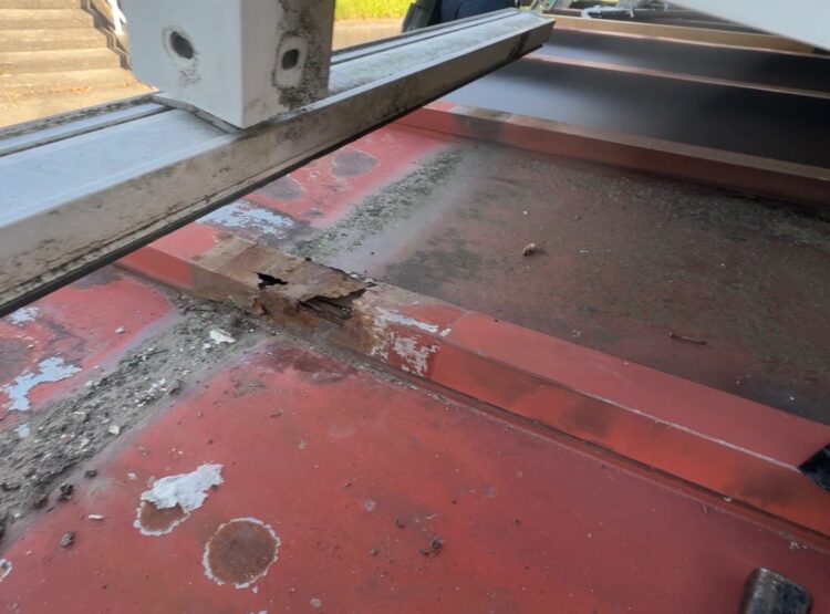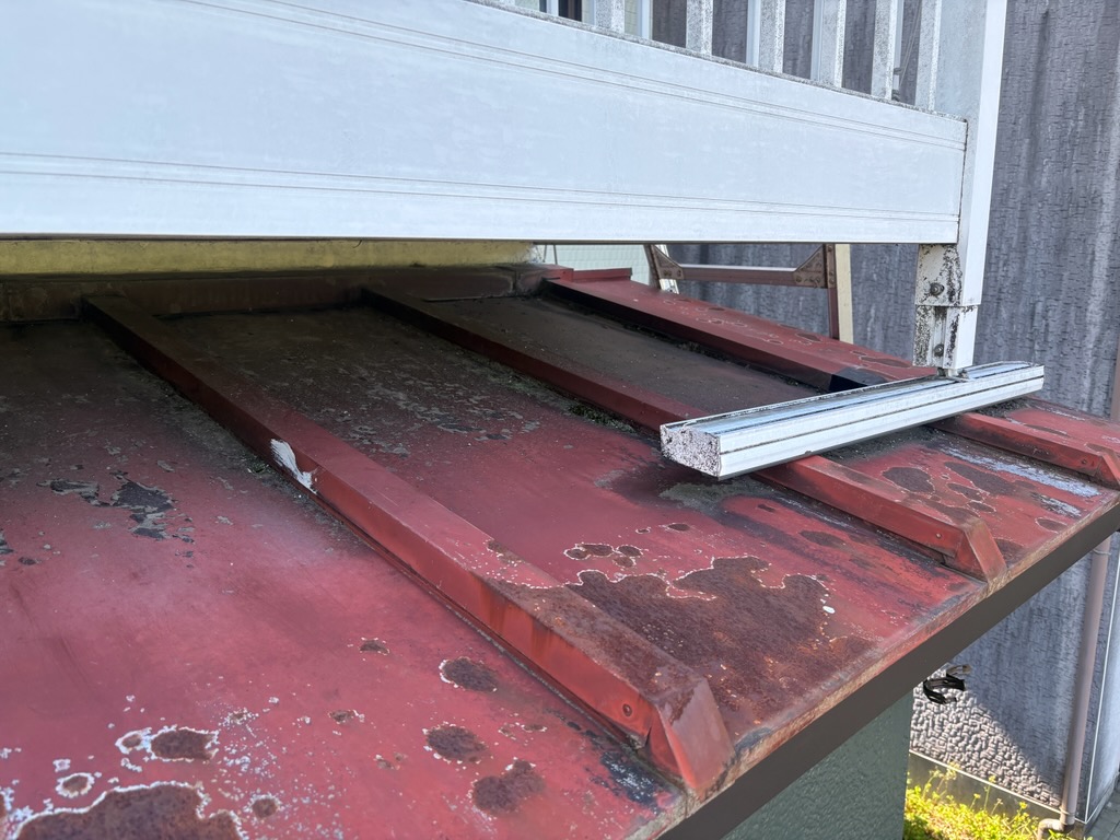 屋根部分では、ベランダの支柱と接する箇所に、経年劣化による腐食(サビ)によって広がった穴が見られ、雨水の侵入経路となっていました。